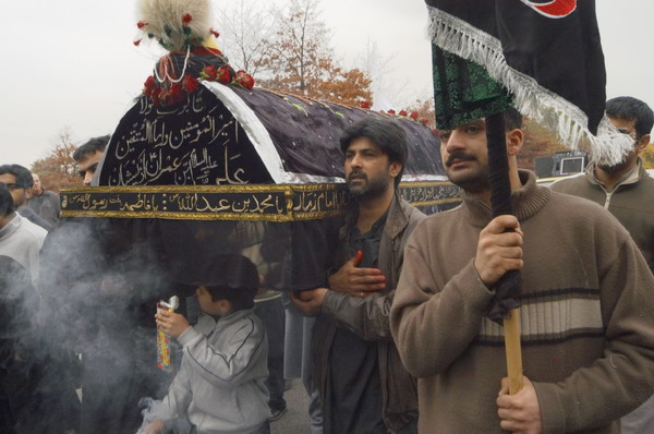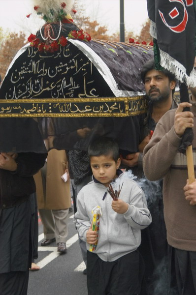 ![]() A small boy carries buring incense sticks, while elders shoulder the heavy load of the taboot. ![]() |