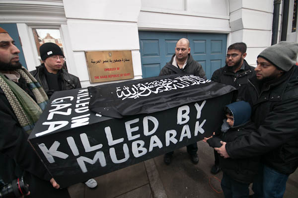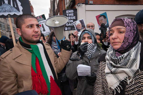 Demonstrations have taken place every day opposite the Israeli Embassy in Kensington since Israel started their attacks on Gaza last Saturday. On Friday around 500 Palestinian supporters demonstrated outside the Egyptian Embassy in Mayfair, calling for greater support for the Palestinians in Gaza and in particular the opening of the border crossing from Gaza to Egypt they control.