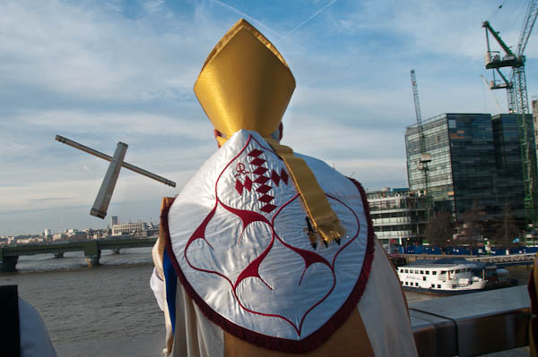 below another cross in the sky.Once again this year the congregations of the two Anglican churches at each end of London Bridge - the City church of St Magnus the Martyr and Southwark Cathedral met in procession at the centre of the bridge for a short service to bless the River Thames and all who work on the river.