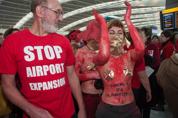 Following the government decision to press ahead with airport expansion and build a third runway at Heathrow despite the environmental consequences announced earlier in the week, several hundred people turned up at Terminal 5 for a 'flashmob' protest at 12 noon on Saturday.