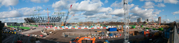 If you've not managed to see the Olympic site recently, here's a roughly 180 degree view - the wall at left is the same wass as at the right. There were some fine clouds on Sunday, so it seemed an opportunity not to miss. The full size version is rather too large to put on line but the link below goes to a large enough version to view, along with a second slightly less wide image taken from a few metres further on.