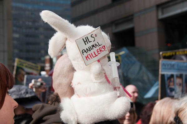 'HLS=Animal killers' - rabbit with placard and syringe