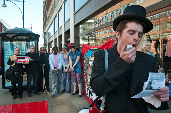 As the models paraded, shoppers were told of workers in Bangladesh being paid 7p an hour and working 80 hour weeks