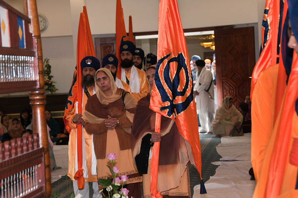 The Panj Pyare stand behind the Guru Granth Sahib during the worship