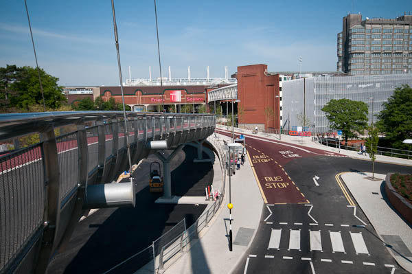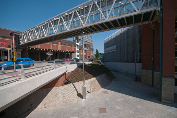 with a rather strange pedestrian/cycle bridge across the railway and a very ugly modern shopping centre