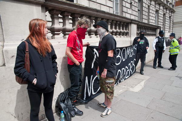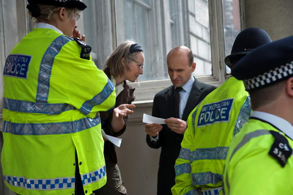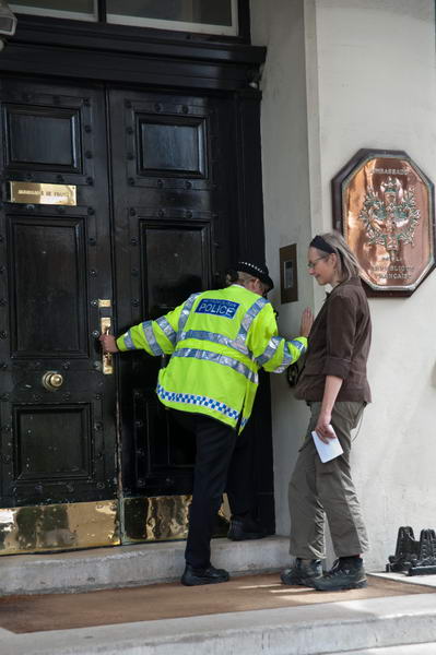 ![]() An officer takes a demonstrator to the door and one of the diplomats comes out to talk to her |