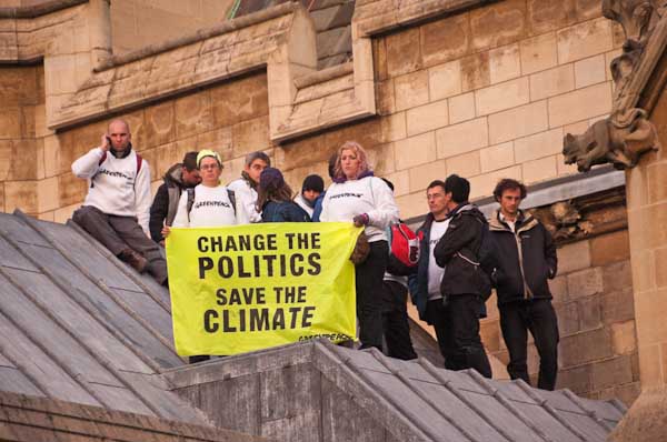 one cornerDisplaying bright yellow banners with the message 'CHANGE THE POLITICS SAVE THE CLIMATE’ the Greenpeace demonstrators called on the UK Government to take effective measures to combat climate change, including stopping airport expansion, a refocus of taxes on pollution, fair financing to help pay for low carbon development in poorer countries, an increase in government and private investment in alternative energy and a switch towards renewable energy and an upgraded grid.