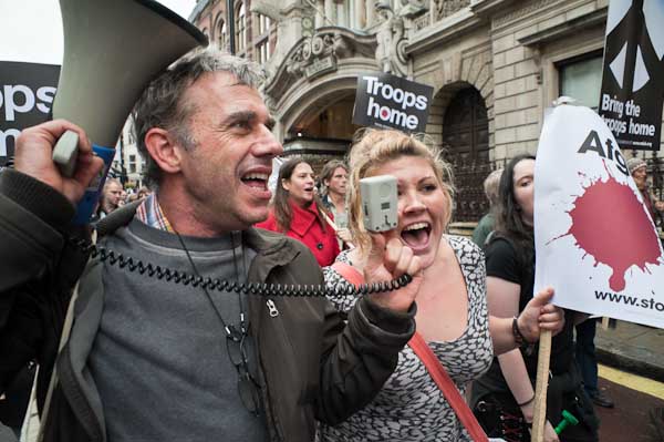 Among those who spoke at the event (and probably the only person who could lawfully use a megaphone there under the SOCPA which bans and limits protests in the area around Westminster) was veteran peace campaigner Brian Haw, still continuing his protest in Parliament Square after more than 3000 days (over 8 years since 2 June 2001) and various legal and illegal attempts by police and others to oust him. Now walking with the aid of crutches he still showed the fighting spirit that has kept him going "for as long as it takes."