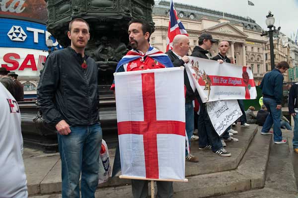 The atmosphere at Piccadilly Circus was quiet and friendly and although there were several police vans down the street there was nothing for them to do. The right wing demonstrators talked and gave interviews in which they were insistent that they were not racist or opposed to Muslims in any way, but simply opposed to the imposition of sharia law in the UK. For the most part the two groups of protesters kept a few yards apart, but some of the English Democrats and others did come to talk with the Muslim groups. One young man who did express a racist view was rapidly told by his friends he was out of order.
