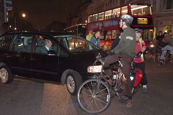 Cyclists stop traffic to allow the Mass to go round Parliament Square