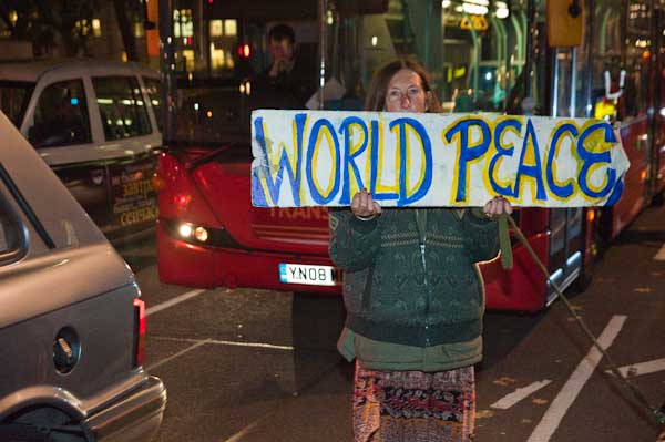 One of the people from Parliament Square brings out her World Peace siong next to the Mass