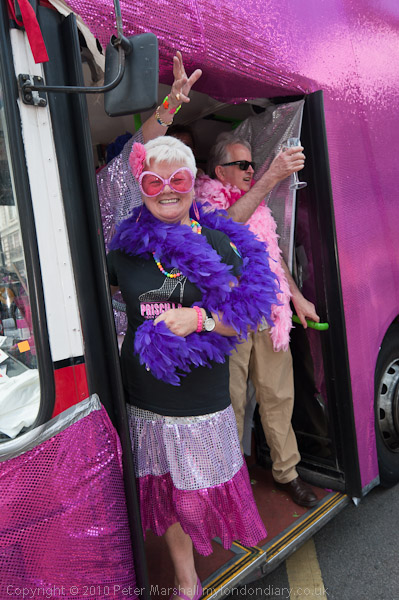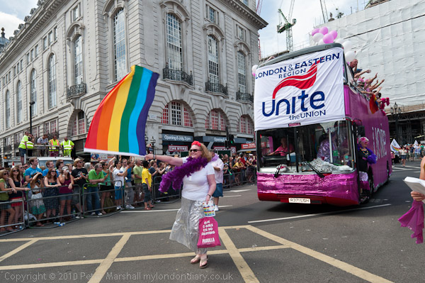 The Unite London & Eastern Region bus, led by a woman with a rainbow flag