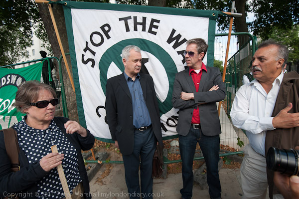 ![]() The Stop the War demo was continuing opposite Downing St, though attendance was rather low ![]() The Democracy Camp came with their banner and stood in front of the Downing St gates ![]() ![]() ![]() They called for the others to come and join them outside Downing St - where protest is prohibited ![]() ![]() ![]() |