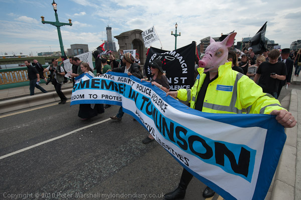 The protesters march into the city to pay respects at the place where Tomlinson died