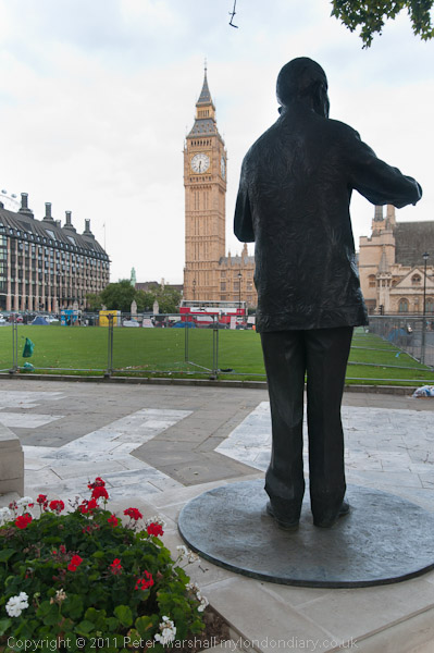 ![]() The protesters start to pack up after around an hour and we go home ![]() I walk past Westminster Cathedral ![]() and offices to Parliament Square, where I take a couple of pictures and talk to Barbara Tucker, recently out of prison ![]() ![]() There is no one in at the Peace Strike as I pass |