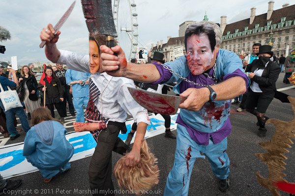 While massive and dangerous cuts were being made by a butcher held back on chains