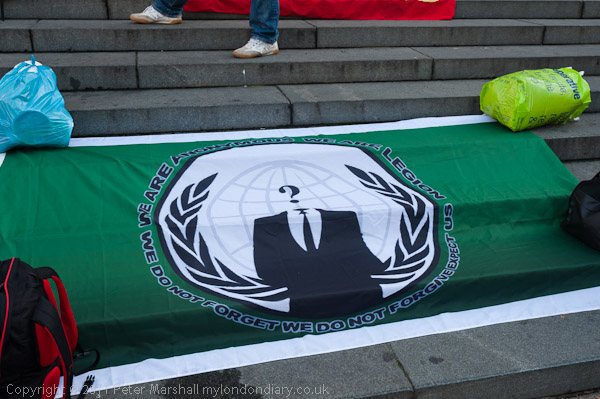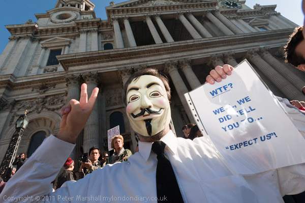 Anonymous protester makes V sign in front of St Pauls
