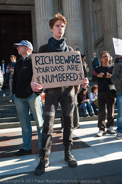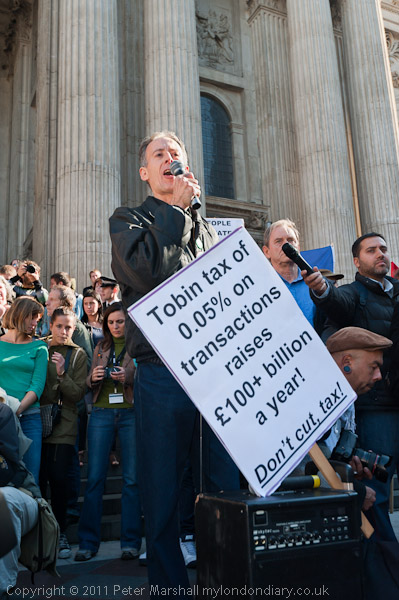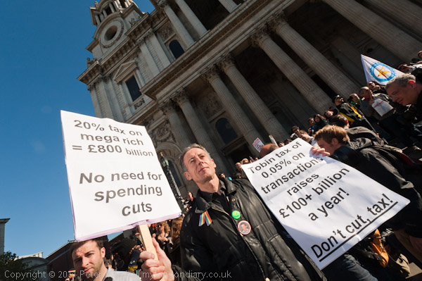 More pictures of Peter Tatchell with placards for a Tobin tax on financial transactinos and a 20% tax on the mega-rich
