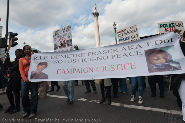 The march with its banner 'No More Deaths in Custody' leaves from Trafalgar Square, walking at a funeral pace