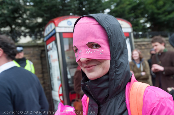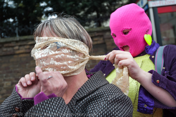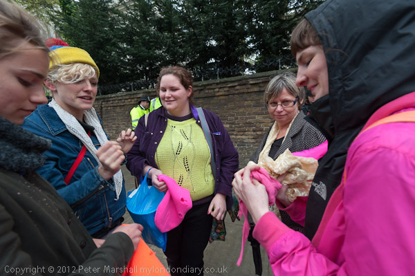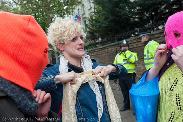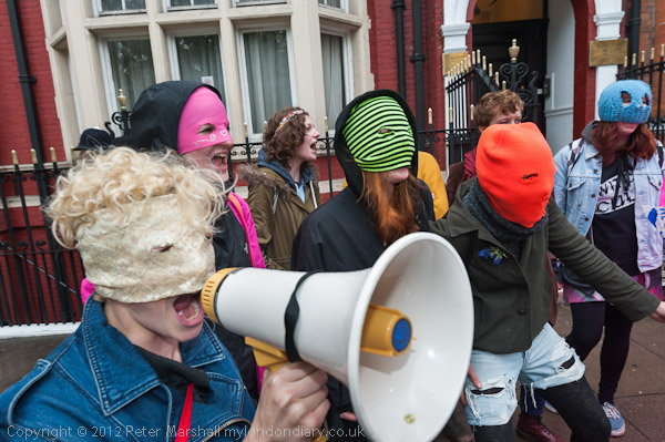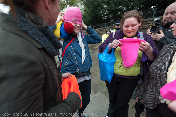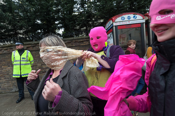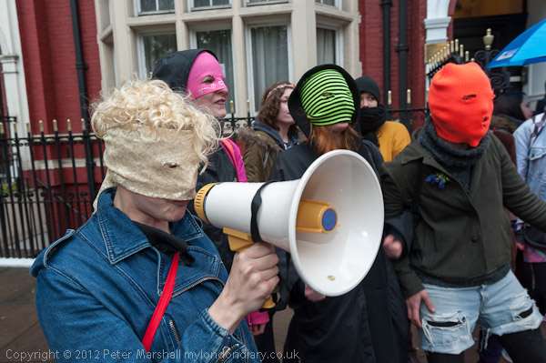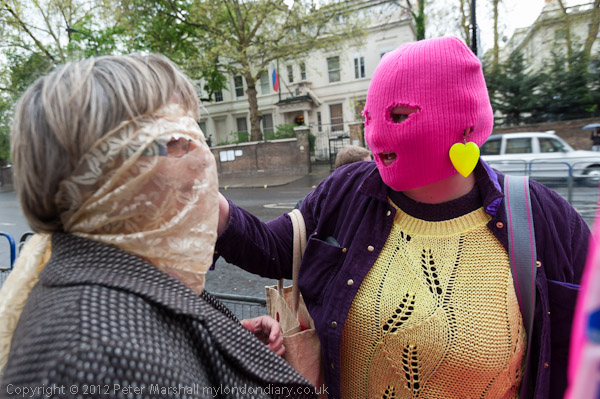 People gathered outside the Russian embassy and put on hoods like those worn by Pussy Riot