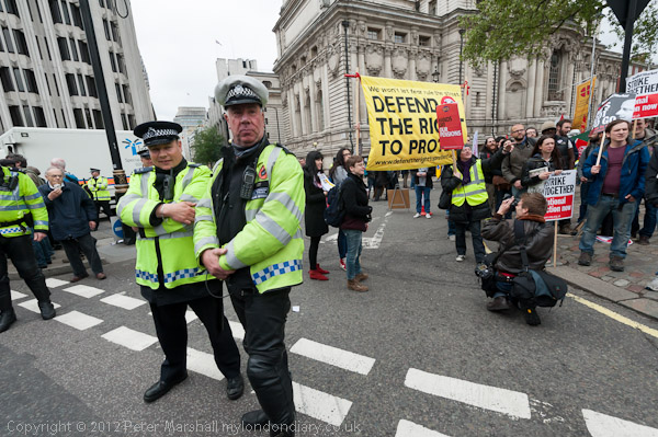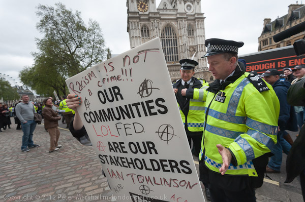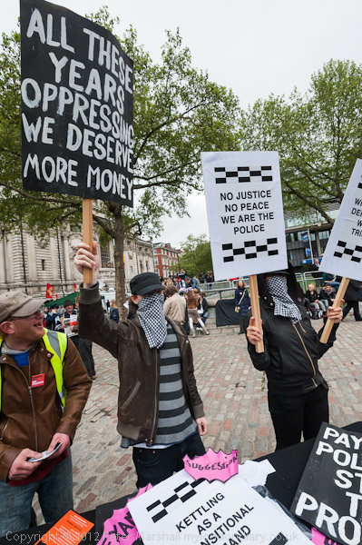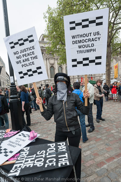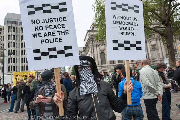 The Defend The Right To Protest group reminded police marchers of Alfie Meadows, Sean Rigg, Ian Tomlinson, Jean Charles de Menezes and others
