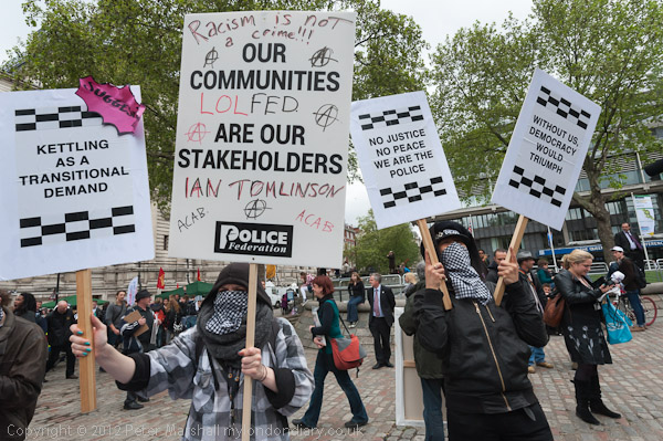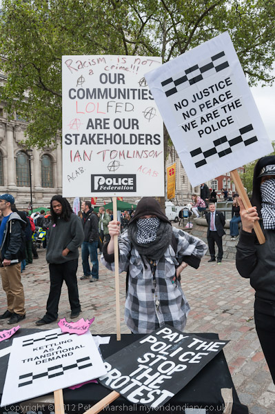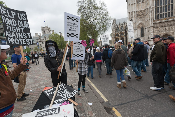 A police line in front of the 'Defend the Right To Protest' banner - another piece of intimidation