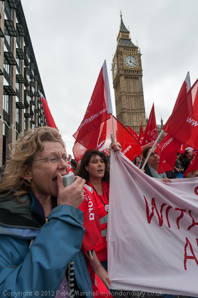 After an open air rally outside St Thomas' Hospital, more than a thousand strikers marched across Westminster Bridge