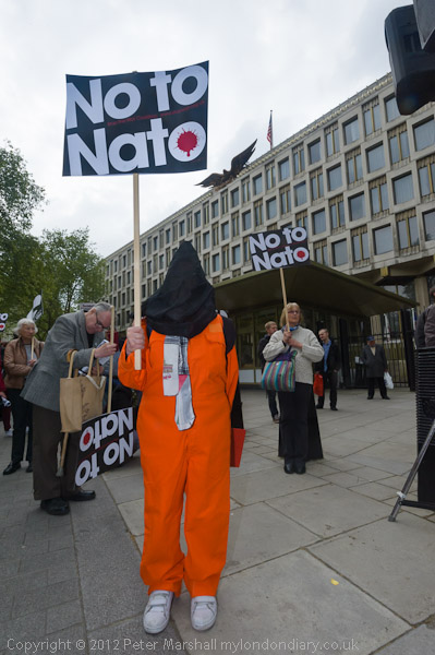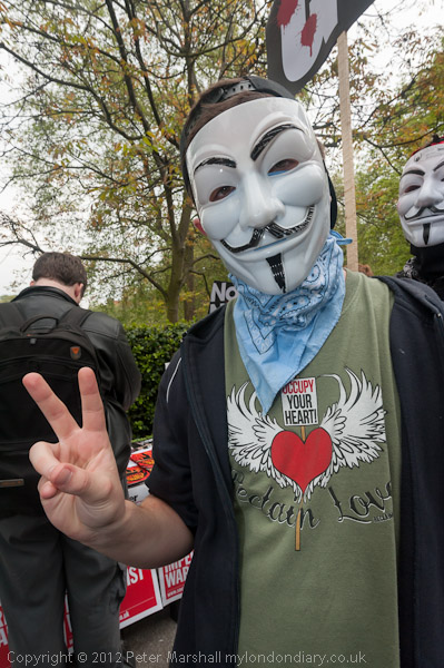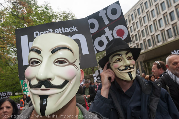 Anonymous masked suporters hold Stop The War placards at the US Embassy