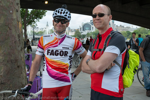 Unfortunately the start was chaotic, partly because of the large number of tourists and others with cameras pestering some of the riders, but also because of the complete lack of traffic control around the busy Hyde Park roundabout which made exiting from the centre island where the ride had gathered extremely dangerous as cyclists had to ride through the traffic on the roundabout and emerging from Knightsbridge and Park Lane on their way to Piccadilly.