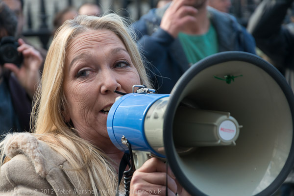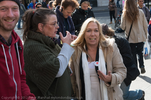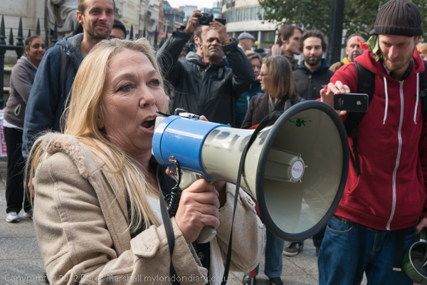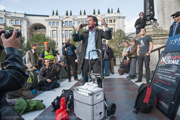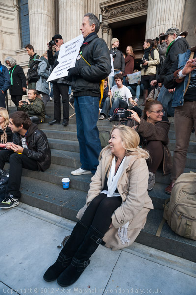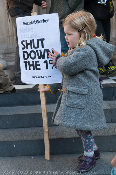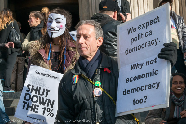 Peter Tatchell with his own placard 'We expect political democracy. Why not economic democracy too?'