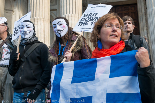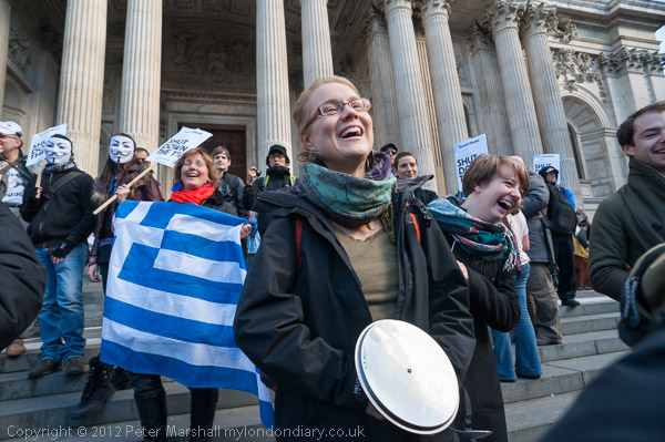 Anonymous and Greek protesters on the steps