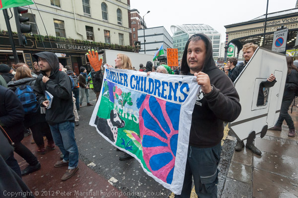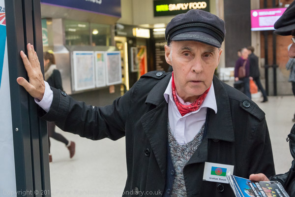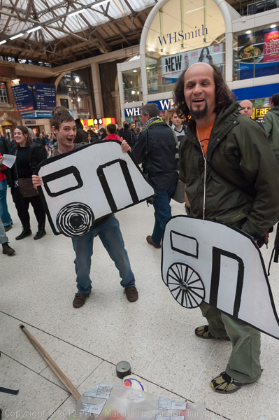 In Victoria Station: Board panels were painted as caravan sides to carry in the protest