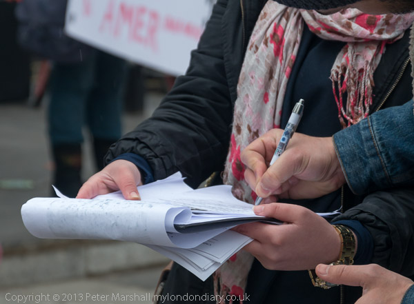 Human rights protesters from Camden with blindfolds and placards calling for the release of Palestinian