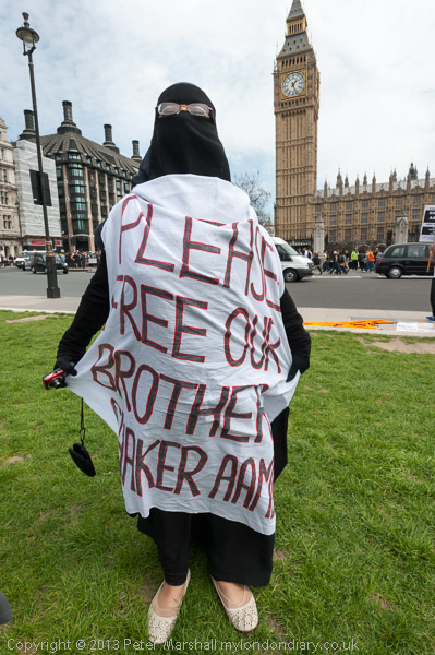 'Please Free Our Brother Shaker Aamer' - and on her back it read 'Shame on Obama for Lying'