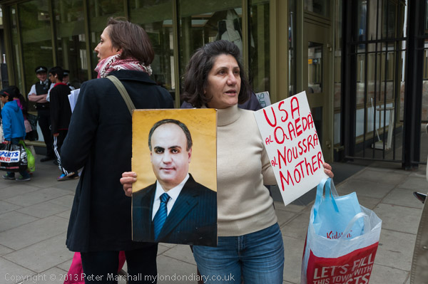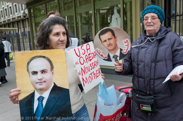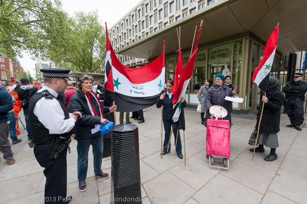 ![]() Pro-Assad protesters. ![]() The Al-Nusra Front or Jabhat al-Nusra, an Al Qaida associate, is part of the Syrian opposition, declared a terrorist group by the US in December 2012 ![]() The pro-Assad protesters were directed to a police pen a few yards to the north. I'd meant to photograph them before I left Grosvenor Square, but was diverted by the arrival of the Muslim group, and when I had finished taking pictures of them had to run not to miss the Tamil march. |