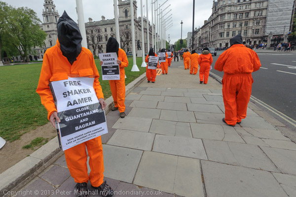 Jeremy Corbyn MP speaking to protesters in their orange jump-suits and black hoods in front of Parliament