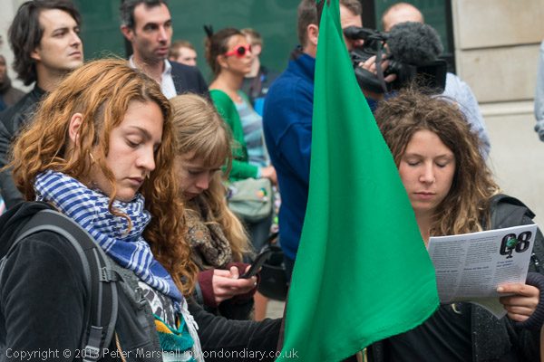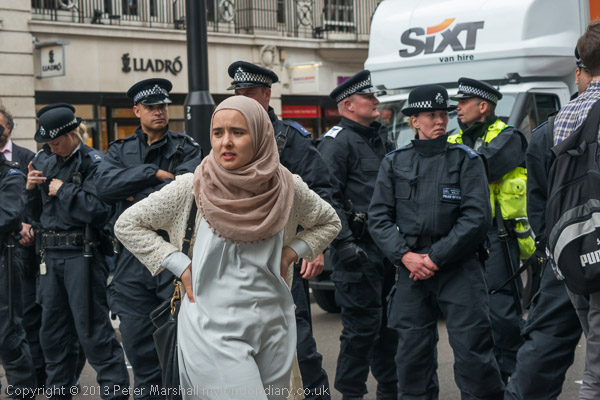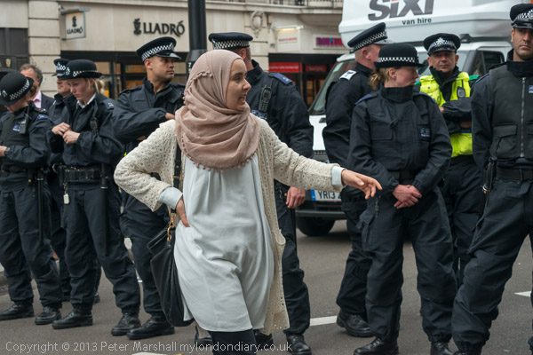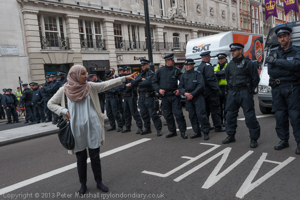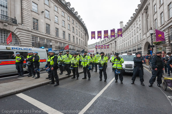A line of police across Piccadilly watched the protesters, some making notes