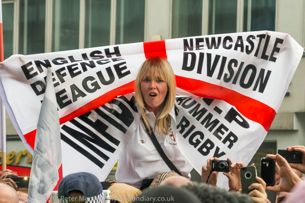 A woman with the EDL Newcastle Division flag watches Tommy speaking