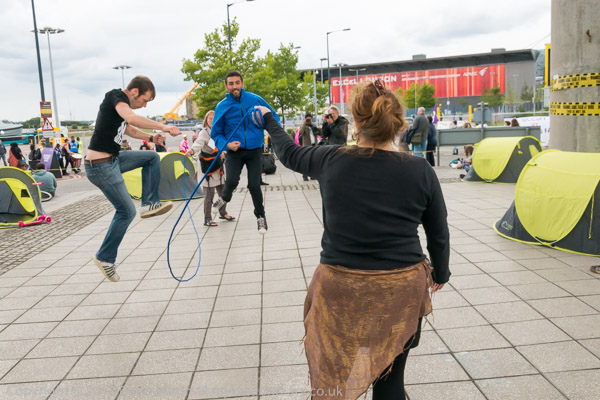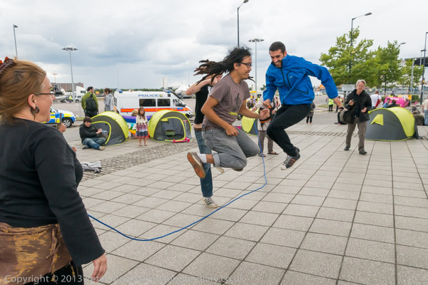 Protesters occupy themselves and photographers with skipping