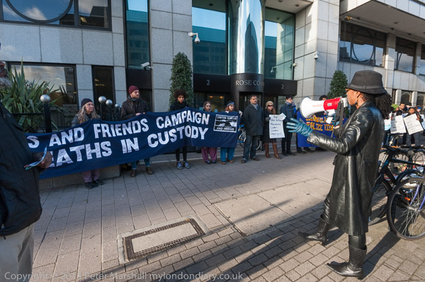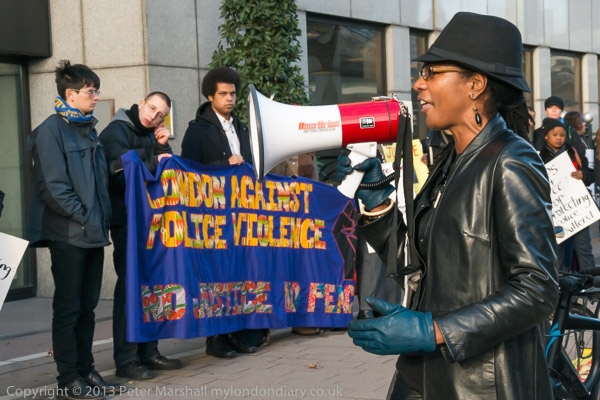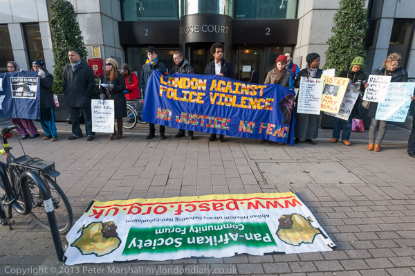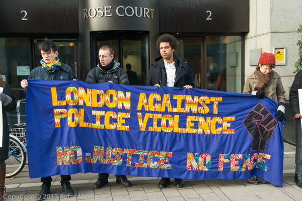 Banners frin 'London Against Police Violence' and Pan-Afrikan Society Community Forum'