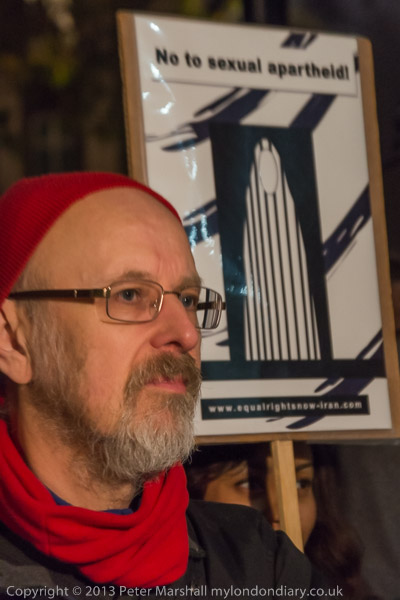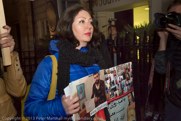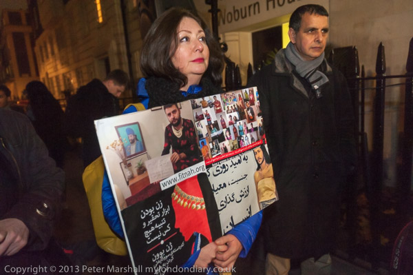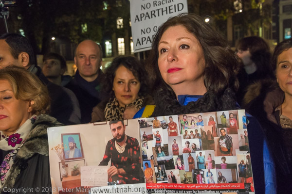 Maryam Namaze carries a poster for Fitnah - Movement for Women’s Liberation, "a protest movement demanding freedom, equality, and secularism and calling for an end to misogynist cultural, religious and moral laws and customs, compulsory veiling, sex apartheid, sex trafficking, and violence against women" which was one of the organisers of the protest