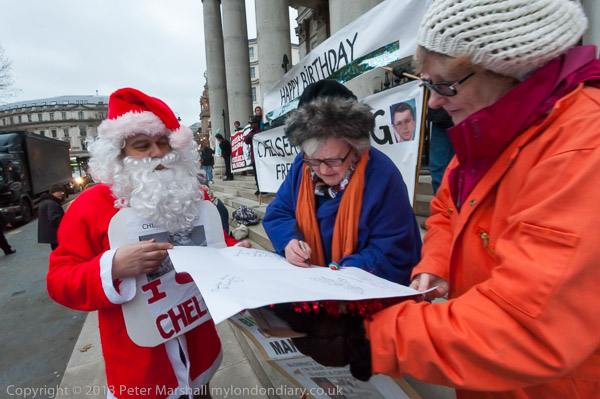 Santa hands out leaflets calling for the release of Chelsea Manning