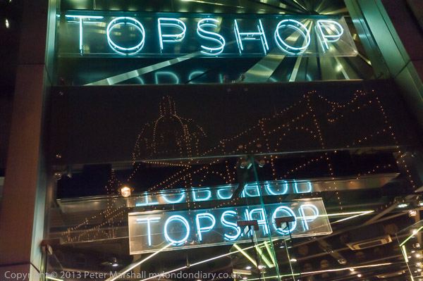 Harrods is traced out in lights on the front of Topshop opposite