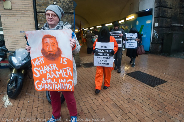 The protesters walk out in single file to go to the MI6 building