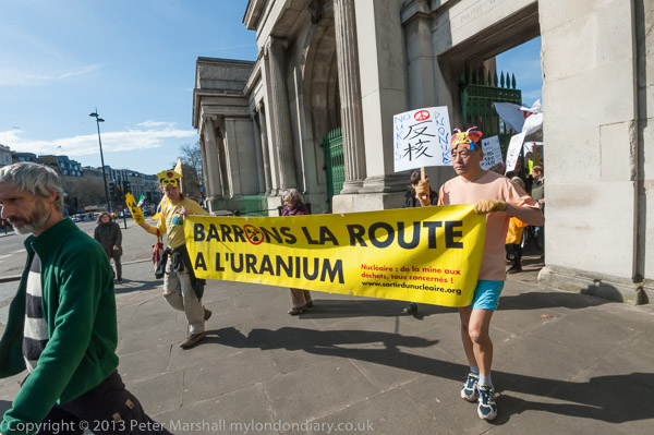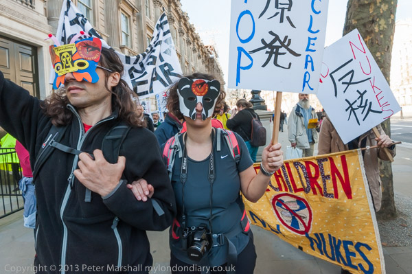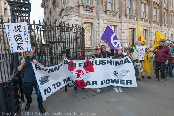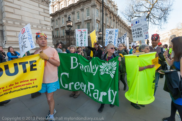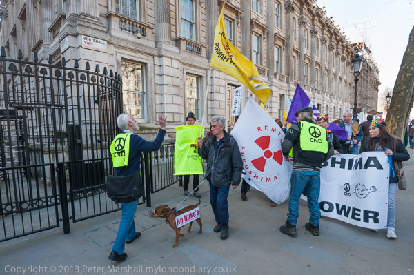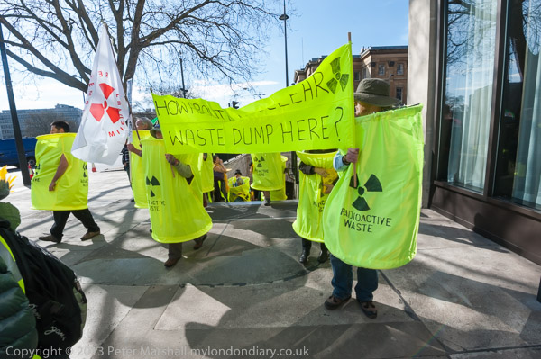 'How About A Nuclear Waste Dump Here?' at Downing St. The protesters went on to a rally opposite Parliament