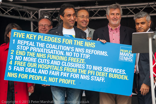 ![]() ![]() 4 Labour MPs and a London Assembly member hold 'Five Key Pledges for the NHS' from the People's March ![]() ![]() 300 milers come up to get their medias - with a pound coin ![]() ![]() ![]() ![]() ![]() Clive Efford MP, Rehana Azam, Sadiq Khan MP, Andy Burnham MP and Dr Onkar Sahota AM Other Labour MPs behind them include Andy Slaughter |