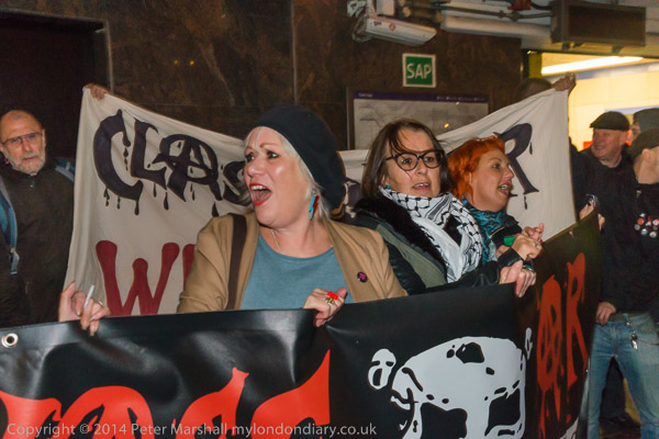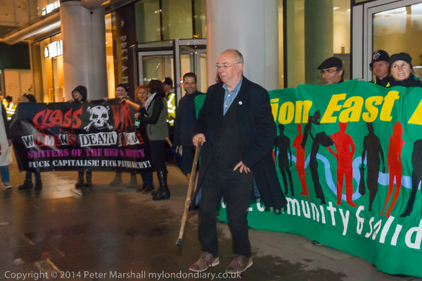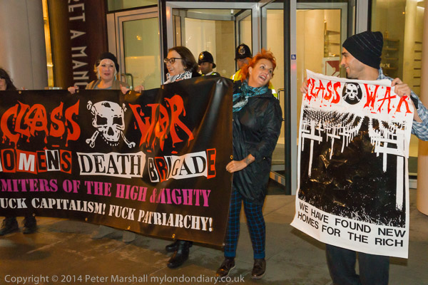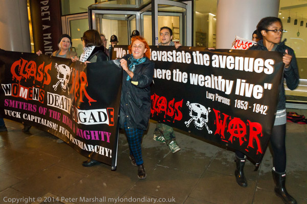 ![]() Ian Bone of Class War speaks and introduces Cosmo, who has come from Cardiff to sing at the protest ![]() ![]() ![]() ![]() Ian Bone does a little dance ![]() and so does the 'Class War We're Back!' banner with Marina Pepper as Cosmo plays and sings ![]() ![]() ![]() and Marina leads the Lucy Parsons banner too ![]() Cosmo is a great songwriter and performer - his web site is worth a visit and you can hear some of the songs he performed |