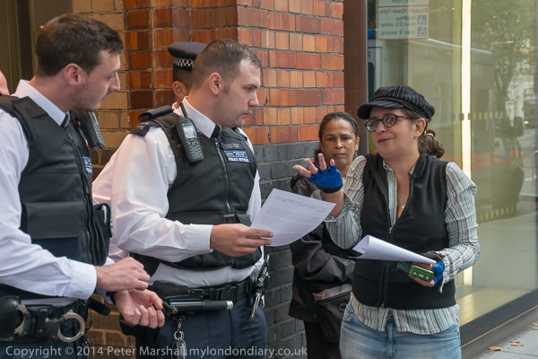 Having handed in the letters,Liliana Dmitrovic talks to the police about the People's Compulsroy Purchase Orders