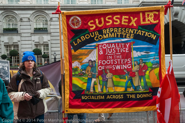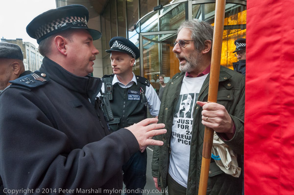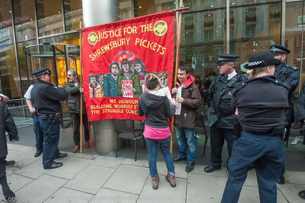 Police officer tries to move the Justice for the Shrewsbury Pickets banner from the pavement outside the IPCC claiming it is obstructing the pavement.