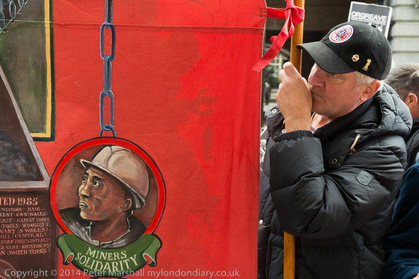 A NUM member holds the North Selby Miners banner at Orgreave Truth and Justice Campaign protest outside the